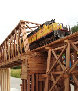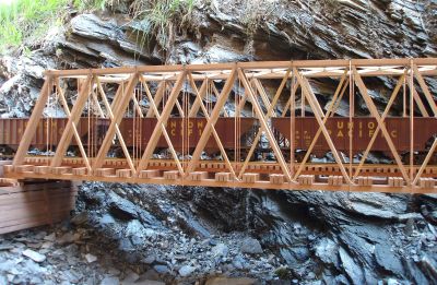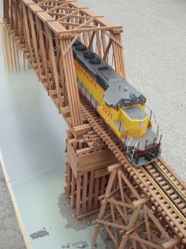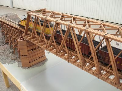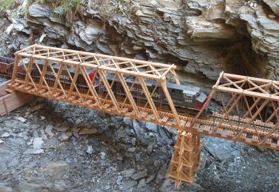 Da nun definitiv die Outdoor Anlage um unser Haus herum nicht mehr existiert (moosecreek line) sind zwei Brückenelemente im Schopf bis auf weiteres eingelagert. Ein Element inkl. der Ufer-Trestle ist in der Innenanlage eingebaut. (Siehe Seite INDOOR-LAYOUT). Ich hoffe, mittelfristig noch eine grössere Innenanlage realisieren zu können. Dannzumal wird ganz bestimmt wieder die gesamte Howe Truss Bridge in die Anlage integriert. Bis dann kann die Brücke vielleicht noch einmal an einer Ausstellung gezeigt werden. |